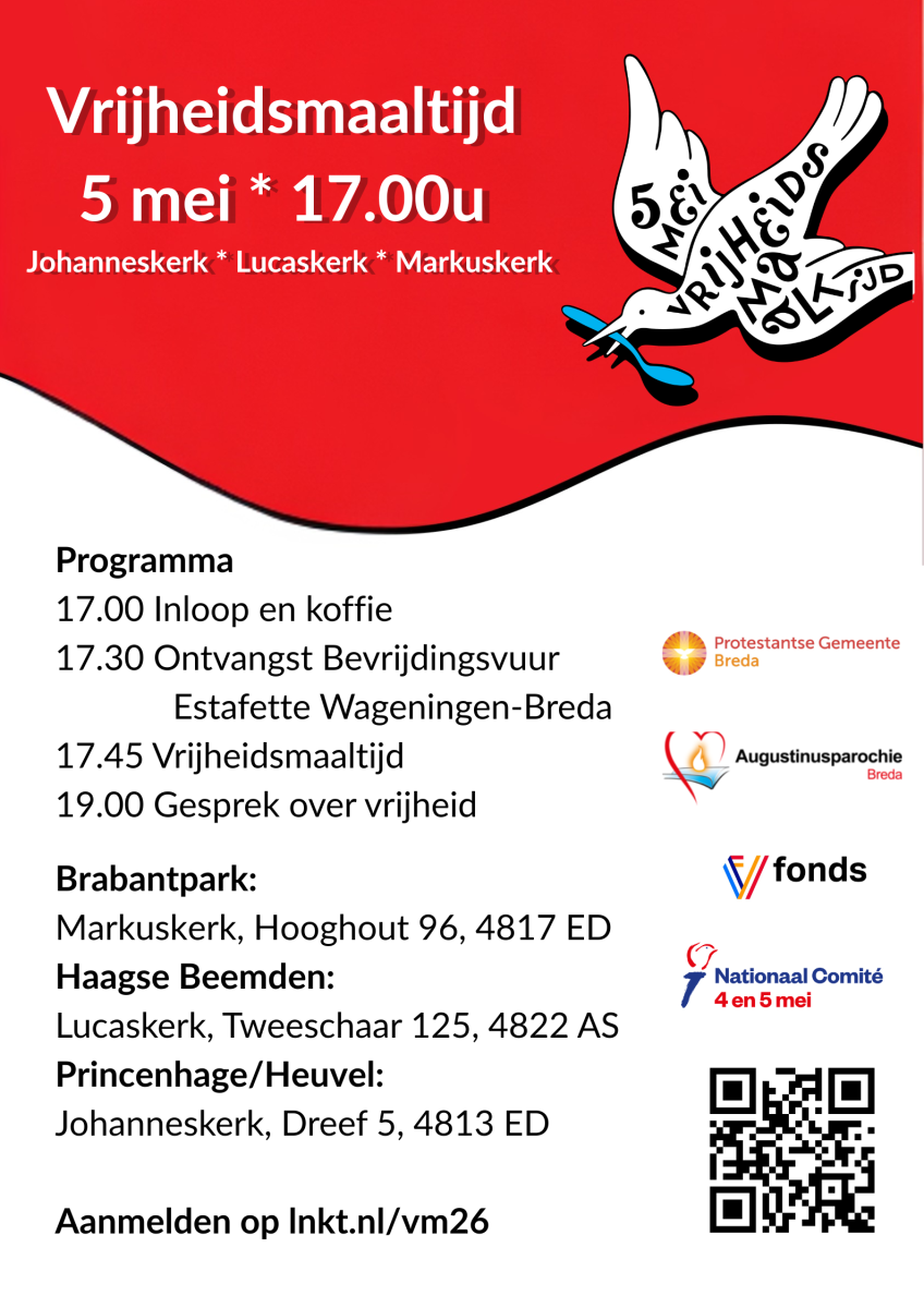 ![]() Vrijheid is kostbaar en kwetsbaar! Dat we in vrijheid samen leven vieren we op 5 mei met elkaar. Heel Nederland schuift aan bij de Vrijheidsmaaltijd. We eten samen om te vieren dat we in vrijheid leven. Dat kan op verschillende plekken in Breda, waaronder in de Markuskerk, Lucaskerk en Johanneskerk. Samen herdenken we de waarde van vrijheid en vieren we de verbondenheid met elkaar. De lopers van het 'Bevrijdingsvuur Estafette Wageningen Breda' brengen het bevrijdingsvuur om 17.30 naar de verschillende kerken in de stad waarna we het vuur de kerk in brengen. Na afloop van de maaltijd is er in elke kerk een inleiding door een spreker of schrijver over vrijheid en vrede en daarna is er ruimte voor gesprek over vrijheid. | ||